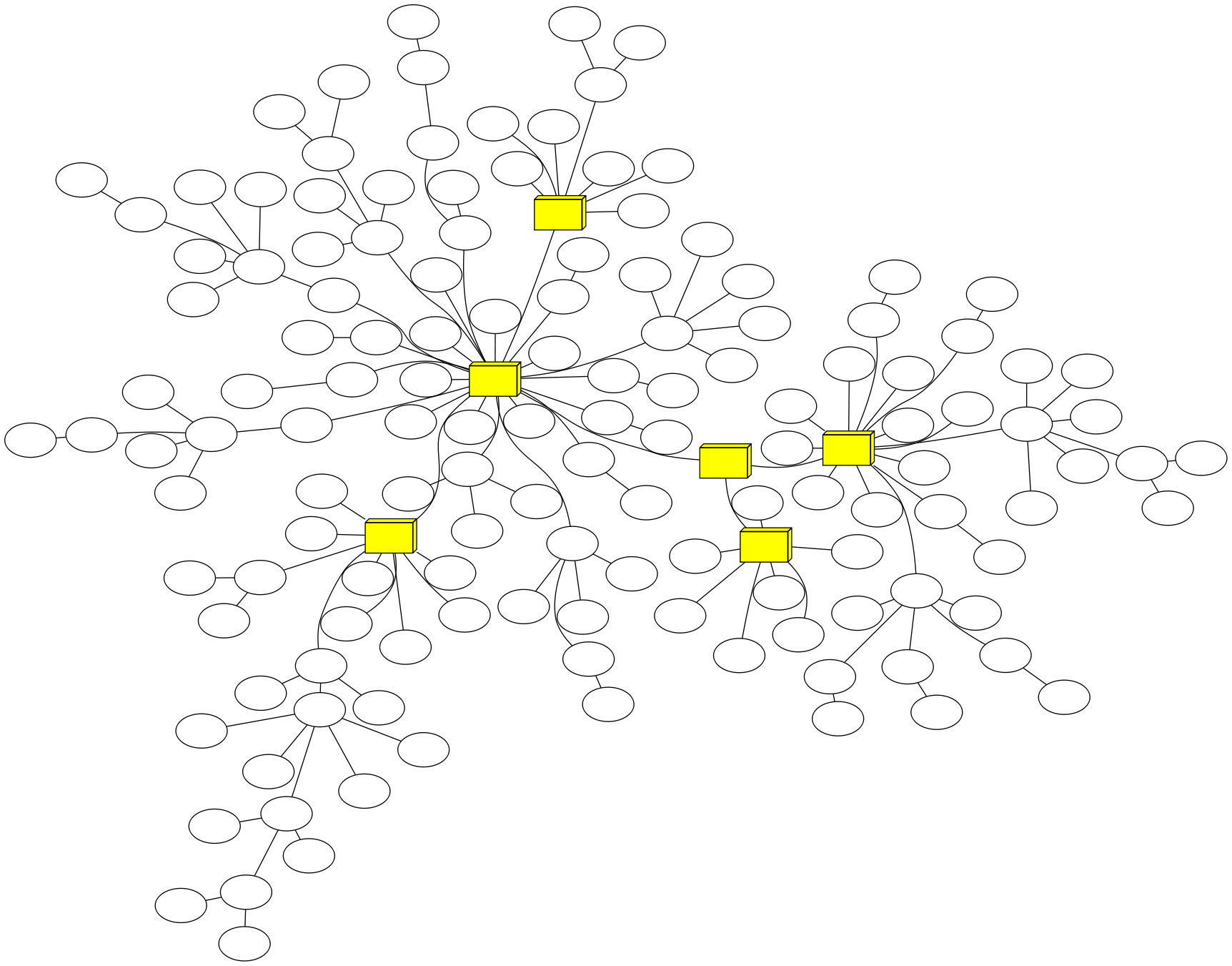 That graph represents the network behind Nucor-Yamato Steel and Nucor Castrip Arkansas, sanitized of sensitive information of course. All of the nodes are Cisco switches, the yellow boxes representing backbone switches (6500 series to be exact). This graph is part of the network information system that I've been working on during the majority of my internship at NYS and gets auto-generated every day, along with more centralized graphs on a per-switch basis. The way the system works is that a periodic Python script goes out to a list of known switches and gathers CDP neighbor information as well as the MAC address tables. Then Nmap scans are ran every 6 hours to scan for hosts, gathering IP addresses, hostnames, and MAC addresses. These MAC addresses are correlated with the MAC tables from the switches to determine which hosts are connected to which ports on what switches. The CDP neighbor information also gives which switches are connected to each other, giving a full scope of how the network's connected. The script which generates the graphs grabs all of that information out of the database, uses NetworkX and pydot to create the graph, and then graphviz to render it into a PNG image. The graph is pretty plain, though. The real version shows switch names and IP addresses. Since the time between graph generation is so long, any more useful information that I could throw onto the graph would quickly become outdated. My grand scheme is to make a quickly-updated graph showing live stats like switch load, link load, link types (fiber, twisted pair, wireless), downed switches, etc. That way, I (or the network supervisor, I guess...) could have a big-screen TV displaying the live health of the network.