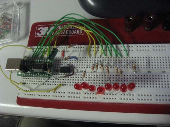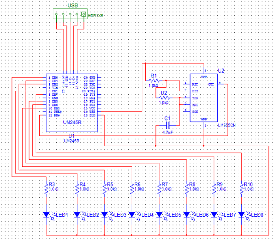 The hardware is pretty simple. Using an UM245R, most of the work is done for you. The UM245R takes in USB data and outputs it on the 8 data pins, and those 8 pins directly drive the LEDs. It's not quite as simple as that, since there's all sorts of protocol with Ready-to-Read and Ready-to-Write and Read and Write pins that go high and low. I just cheated and used at 555 timer to generate a clock signal on the RD pin to give me the data. I just lucked out and the UM245R outputs the last data if there's no new data available.